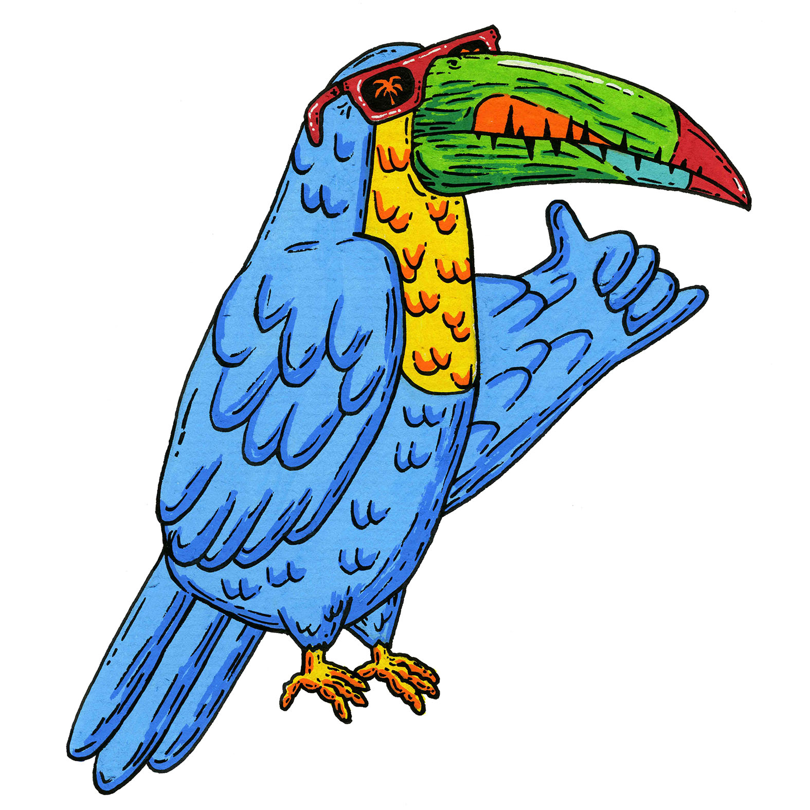 One time Toddy was heaps small and little and all the other birds gave him grief because he had different colours from all the other toucans. Most all the other Toucans had black feathers but Toddy had these sweet blue feathers. Anyhow he didn’t let them get to him because he believed that one day his blue feathers would come in handy. Well many years later when he was mostly grown up the time came when those blue feathers came in super handy. A part came up in the local theatre production that called for a blue feathered bird and you know what, he got the part, partly because he had blue feathers and mostly because he was heaps good at acting and stuff. The rest they say is history.